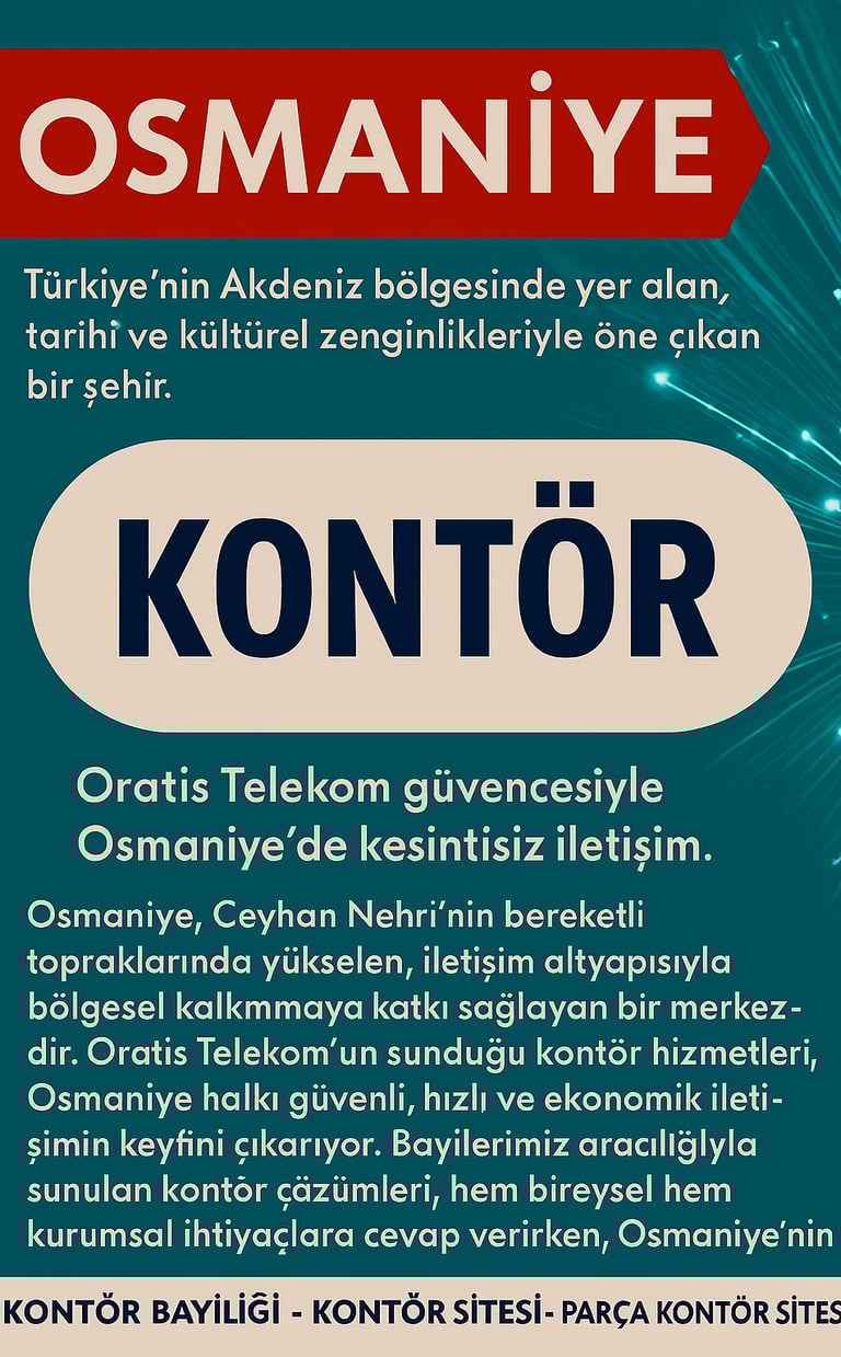 Osmaniye, Ceyhan Havzası’nın bereketli yapısıyla gelişen, dinamik iletişim altyapısına sahip bir ildir. Oratis Telekom kontör çözümleri, tüm operatörlerde hızlı, güvenli ve ekonomik işlem imkânı sunar. Bayilerimiz aracılığıyla 7/24 destek, anlık yükleme ve şeffaf fiyatlandırma ile iletişimde süreklilik sağlanır.